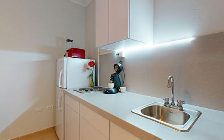 🛋️ Open-Concept Living – Relax in the cozy lounge area with a smart layout and a modern kitchenette.